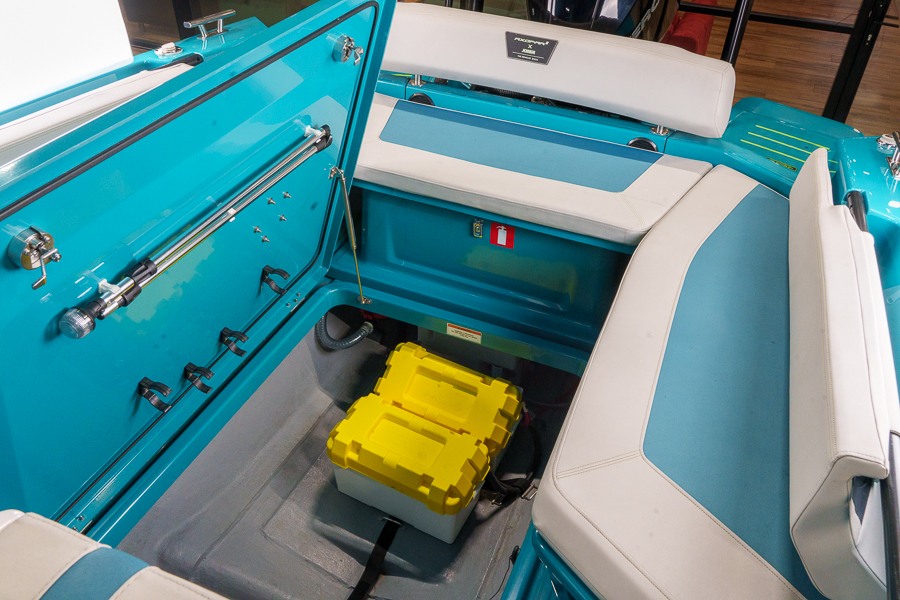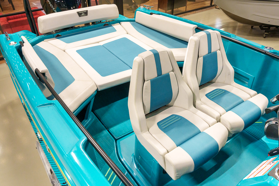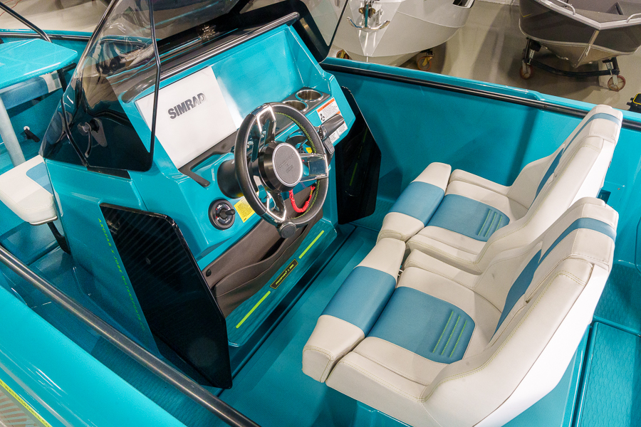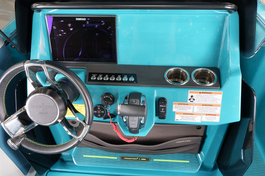 Чистота расположения руля, приборной панели с темно-серым покрытием softtouch, панель переключателей управления в глянцевом черном цвете. Кнопки с подсветкой. Кожаное рулевое колесо с логотипом Axopar, два передних сиденья с поворотным механизмом, регулируемые по длине. Откидной высокий валик, Silvertex Sterling на всех сиденьях и обивке, два держателя для напитков, брызгозащищенный USB-разъем в консоли, зона кокпита без порога, подставка для ног с противоскользящей отделкой, большая крышка порога для консоли и передних сидений.