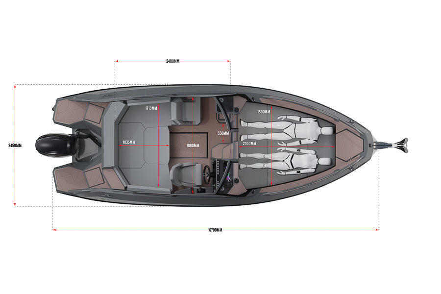 Длина — 6.67, а ширина — 2.47 метров. Корпус изготовлен из алюминиевого сплава повышенной прочности, а его толщина — 4 миллиметра. Этого более чем достаточно для обеспечения надежности и уверенности пассажиров и водителя. Топливный бак вмещает 200 литров.