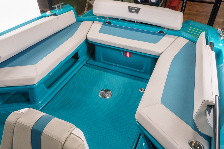 Чистота расположения руля, приборной панели с темно-серым покрытием softtouch, панель переключателей управления в глянцевом черном цвете. Кнопки с подсветкой. Кожаное рулевое колесо с логотипом Axopar, два передних сиденья с поворотным механизмом, регулируемые по длине. Откидной высокий валик, Silvertex Sterling на всех сиденьях и обивке, два держателя для напитков, брызгозащищенный USB-разъем в консоли, зона кокпита без порога, подставка для ног с противоскользящей отделкой, большая крышка порога для консоли и передних сидений.