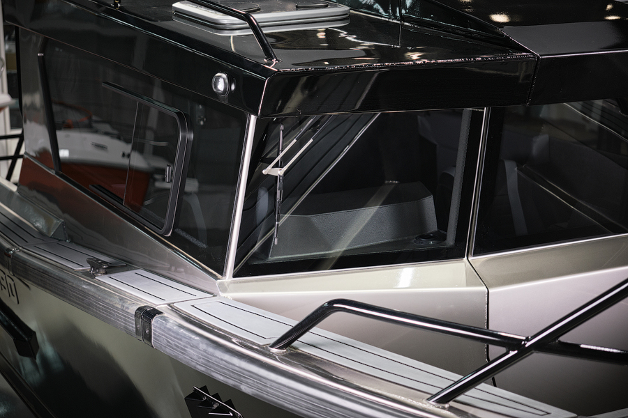 Вход в просторную кабину осуществляется через откидывающуюся дверь, на открытую носовую палубу можно выйти через дверцу в лобовом стекле. Предусмотрены дворники с обеих сторон для прогулок в любую погоду. Удобство перемещения обеспечивают пара потопчин в носу, и еще две - в корме, прочные поручни вдоль бортов и рейлинги на крыше.