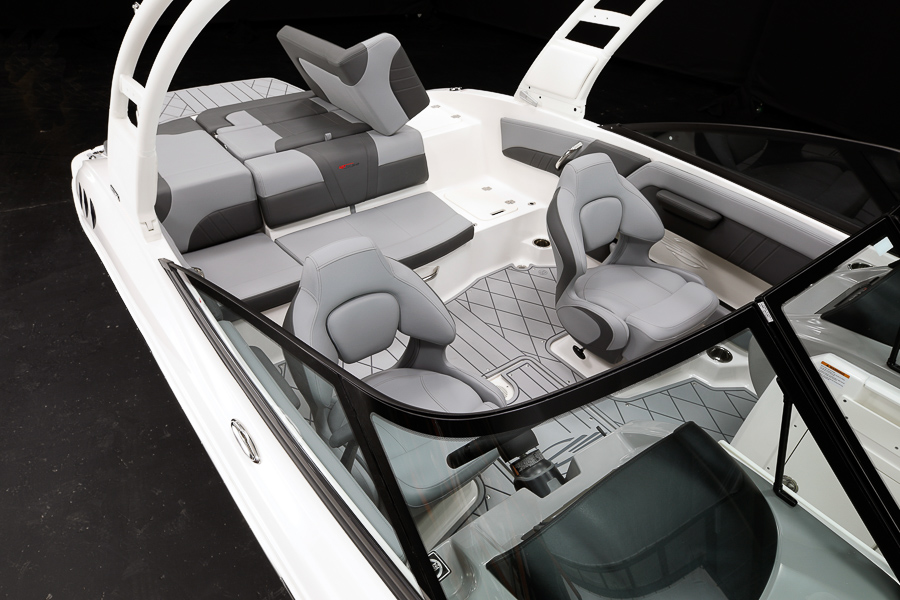 - Основной салон. Мест для хранения в спортивно-прогулочной лодке никогда не бывает много. В основном кокпите Chaparral ГТС1 Surf разработчики предусмотрели хранилища для разных целей: боковые шкафчики для дорожных сумок в консолях, вентилируемый палубный отсек для досок серфингиста, запираемый перчаточный ящик для мелких вещей, сухие рундуки с переключателями батарей. Под центральным сидением на корме расположен кулер для напитков, чтобы охладиться в жару. Подушки с кормового дивана легко снимаются, а ковшеобразные передние кресла проворачиваются на 360 ° и настраивают на активный диалог 6 пассажиров.