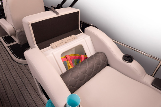 - Кокпит. Пост управления капитана представлен комфортным мягким креслом с теми же возможностями, что и в зоне отдыха носовой части понтона (откидная спинка и подлокотники, регулировка высоты, поворот на 360°). Приборная панель укомплектована цифровыми приборами Faria®, рулевым управлением с электроусилителем Sea Star®, навигатором Simrad® и развлекательным центром Kicker®. По левому борту расположен небольшой диван для отдыха с отсеками для вещей.