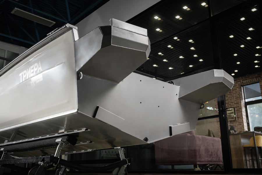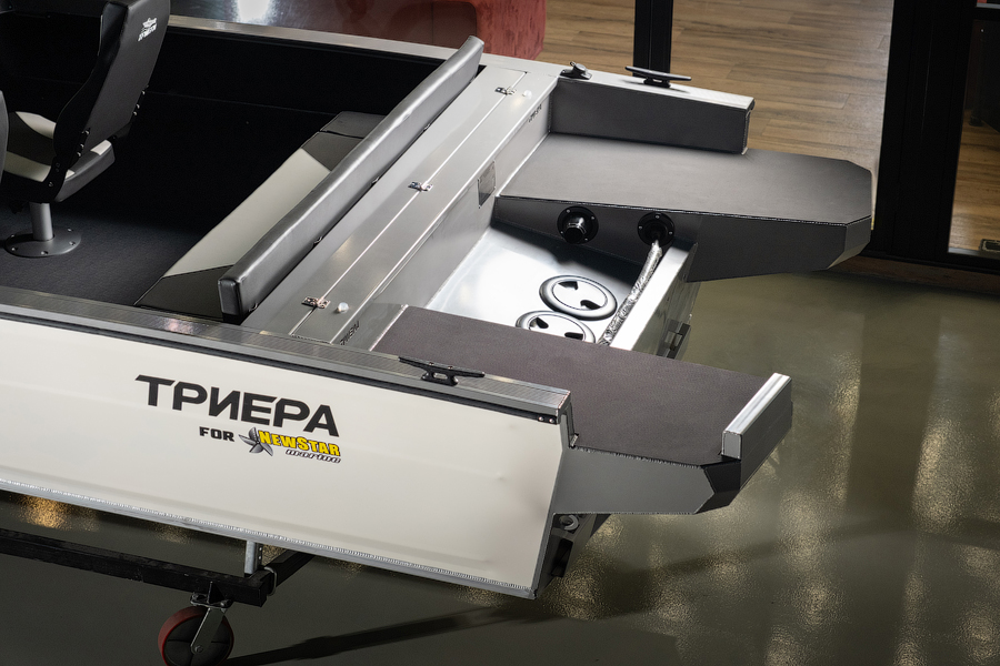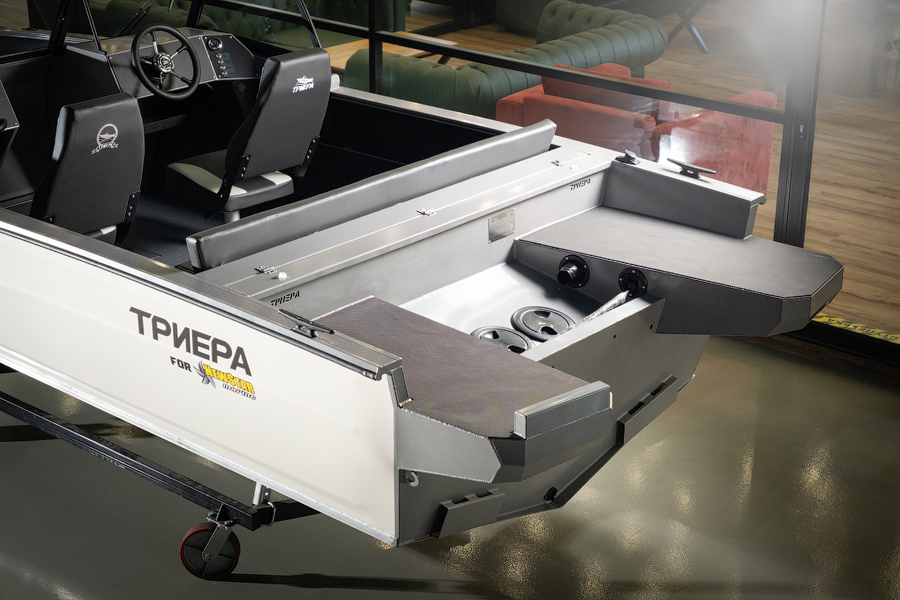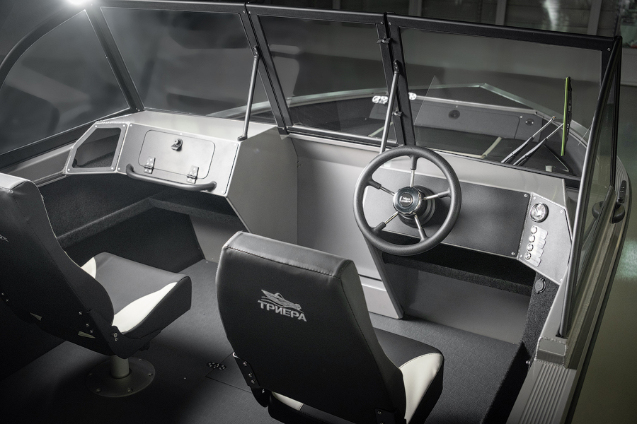 Триера 490 Боурайдер — это судно длиной в 4,9 и шириной в 2 м, которое смело можно назвать прогулочным катером. Лодка вмещает на борту 5 человек и имеет грузоподъемность до 570 кг. Мотор мощностью в 90 л. с. позволяет ей набирать неплохую скорость, а рулевое колесо и комфортное сиденье капитана превращает поездку в настоящее удовольствие.