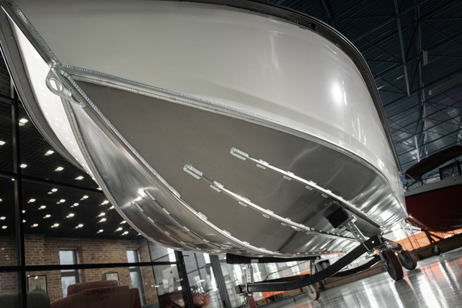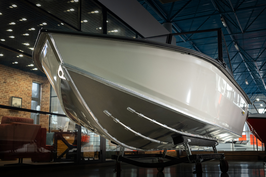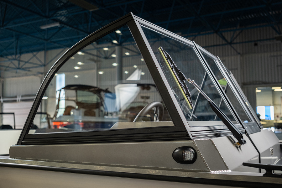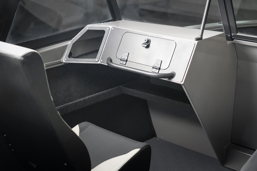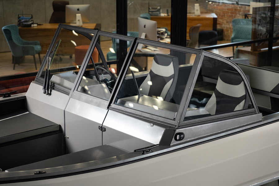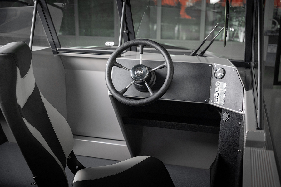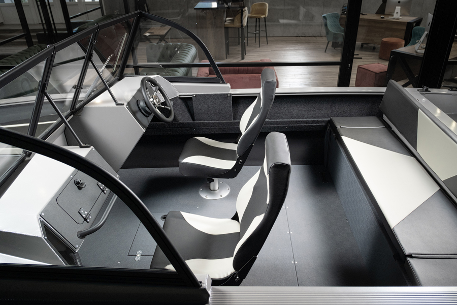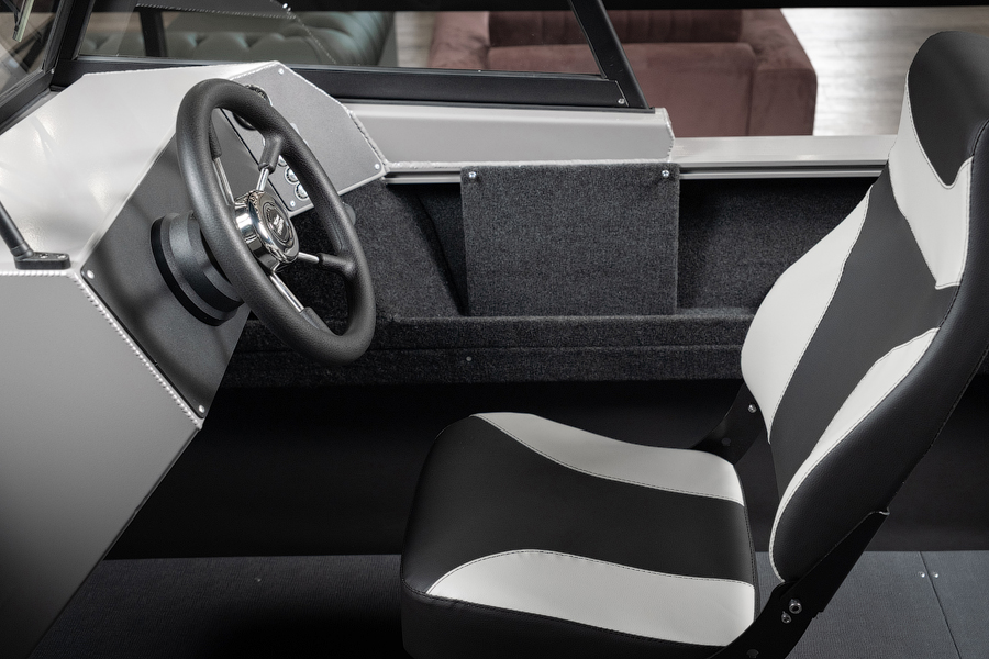 Уже в стартовой комплектации у катера есть ветровое стекло с межконсольной дверкой, полки для вещей, карманы по бортам, кормовой диван и длинный кринолин для удобного купания, ловли рыбы и мелкого ремонта винта. При желании они могут быть дополнены электропакетом, рундуками в полу и прочим опциональным оборудованием.
