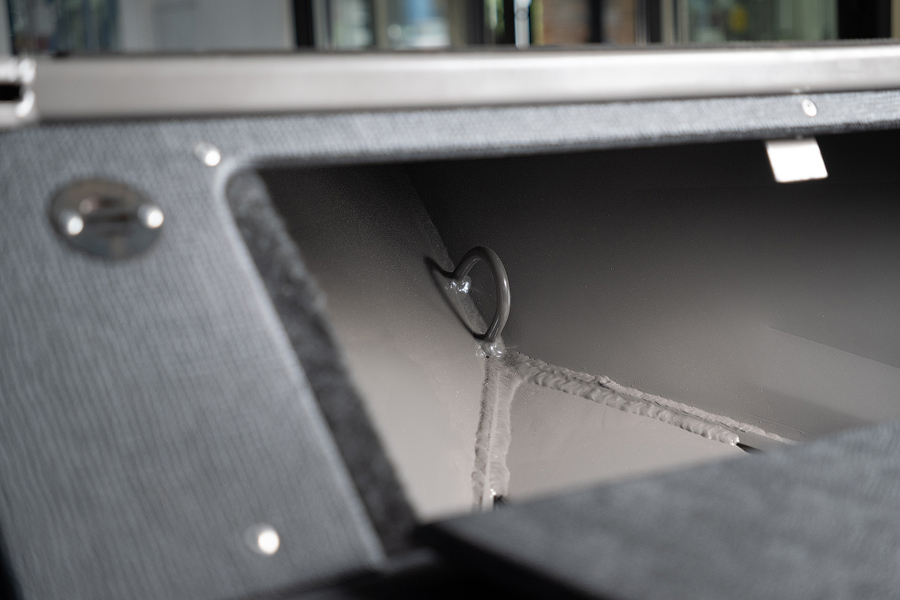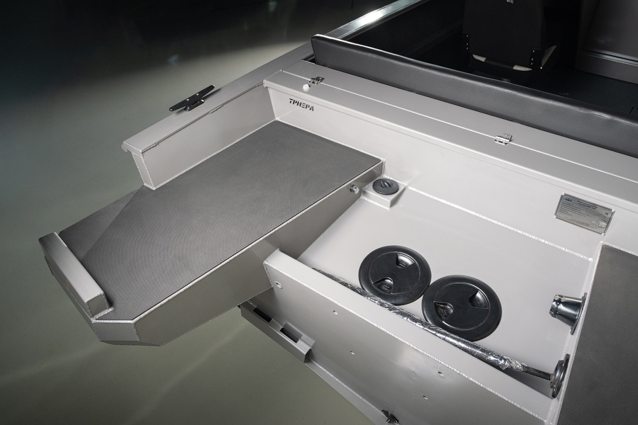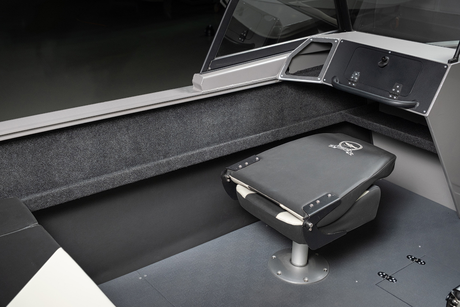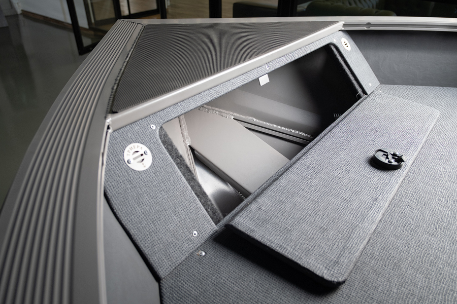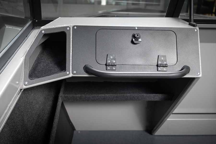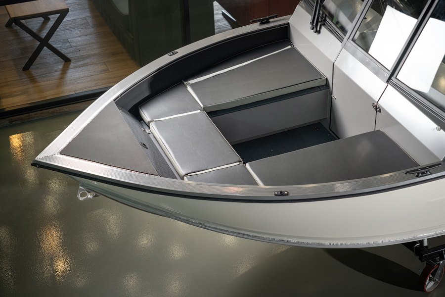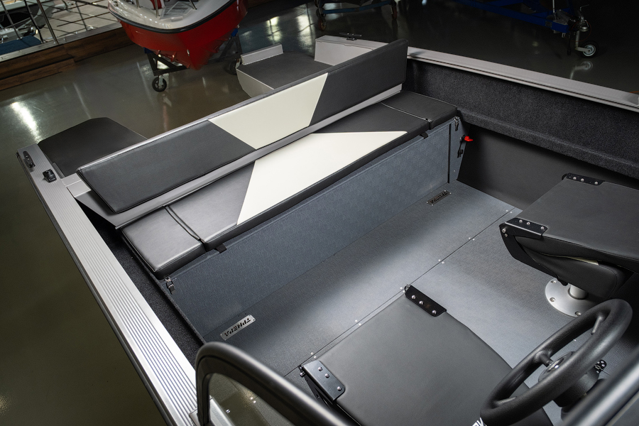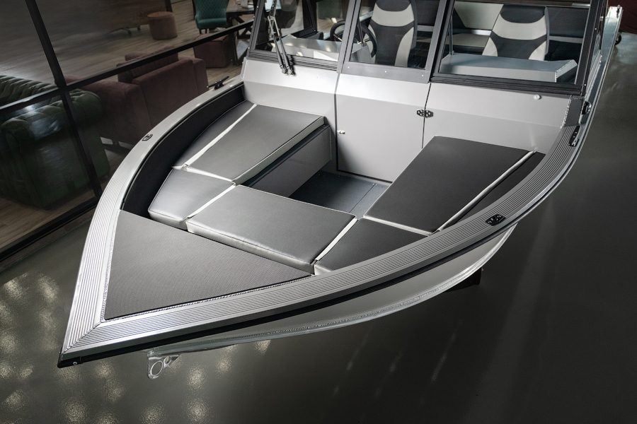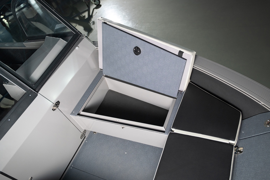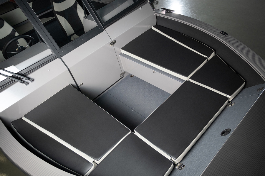 Алюминиевый катер идеально подходит и для отдыха с друзьями. Производитель установил на носу комфортные диваны, которые дополняют места для отдыха в кокпите. Рундуки позволяют взять на борт большое количество вещей и продуктов, которые будут надежно защищены от брызг.