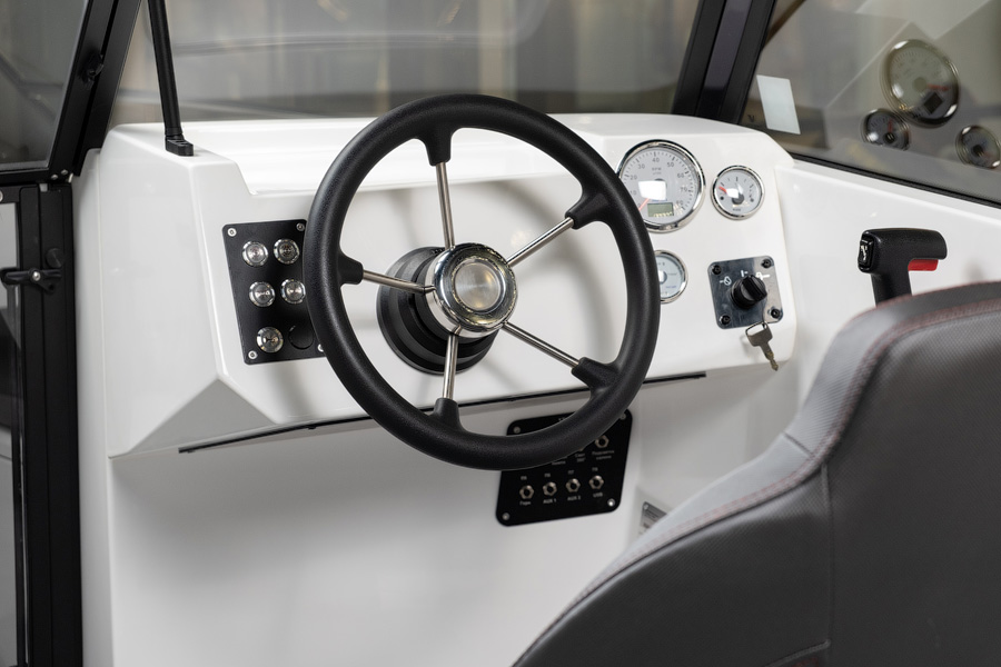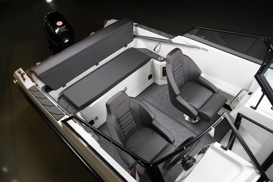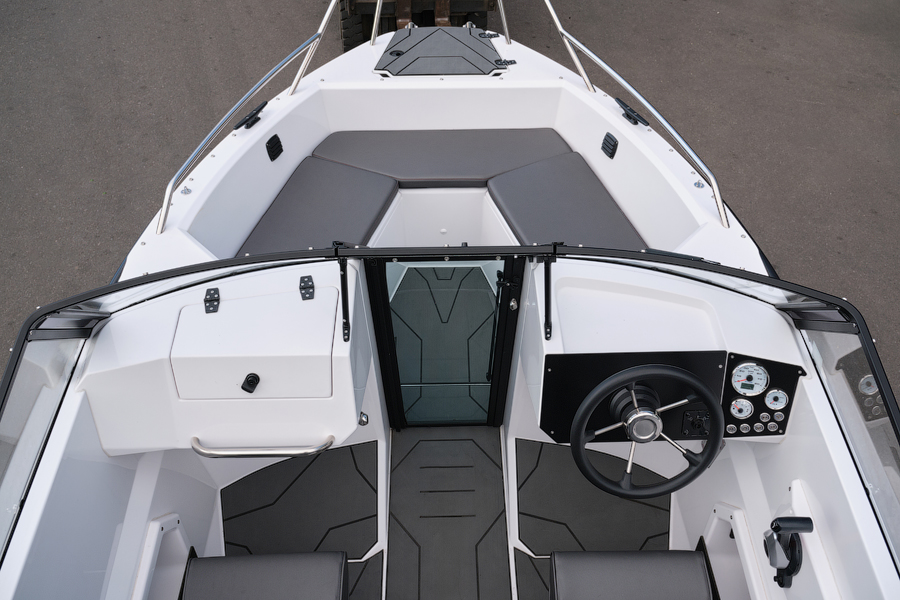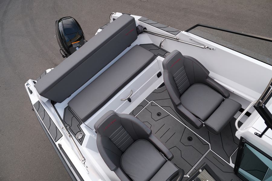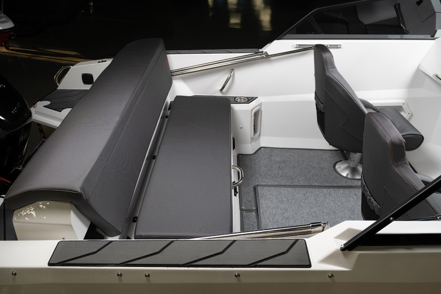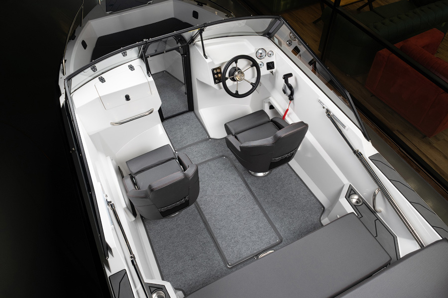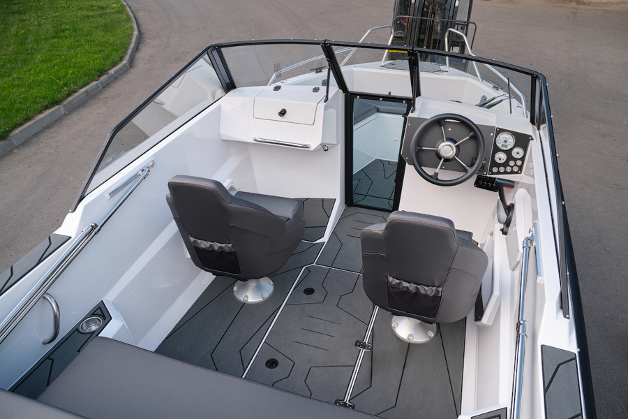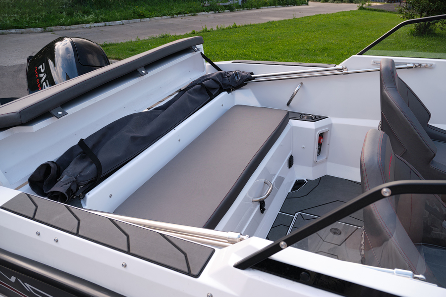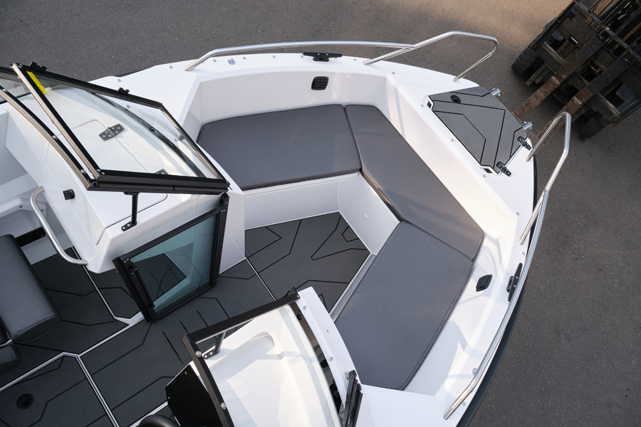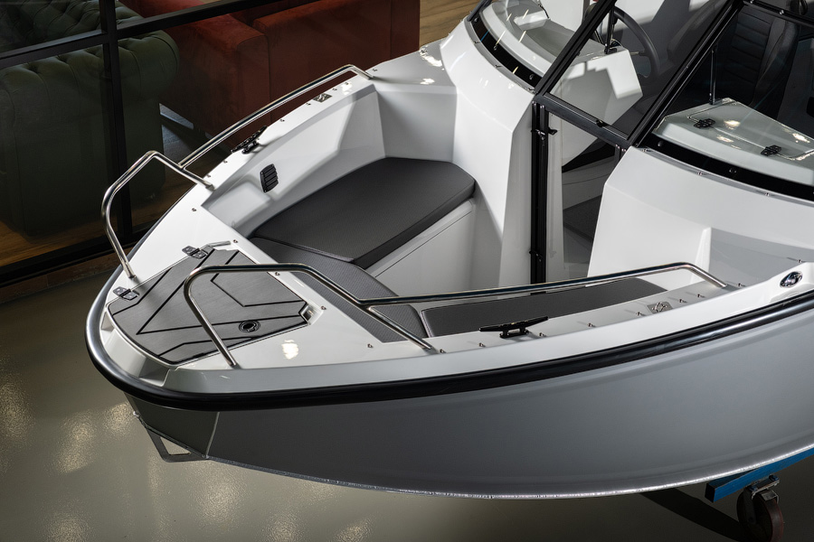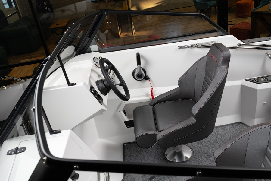 Максимальная пассажировместимость составляет 5 человек. Для борта предусмотрено оснащение подвесным мотором мощностью 80 л/c. Салон укомплектован регулируемыми сиденьями. Тканая обивка Spradling характеризуется стойкостью к ультрафиолету, не разрушается от агрессивных сред и не намокает.