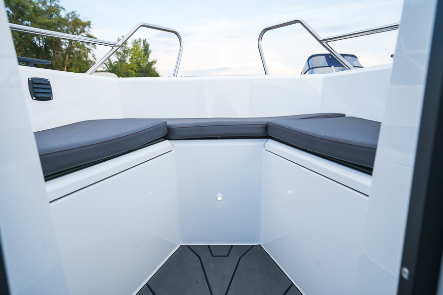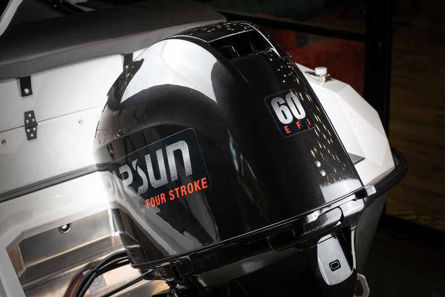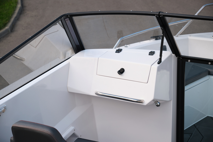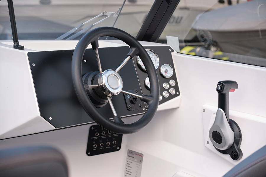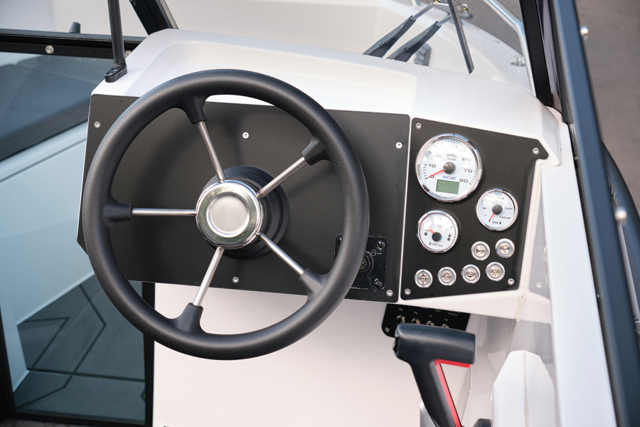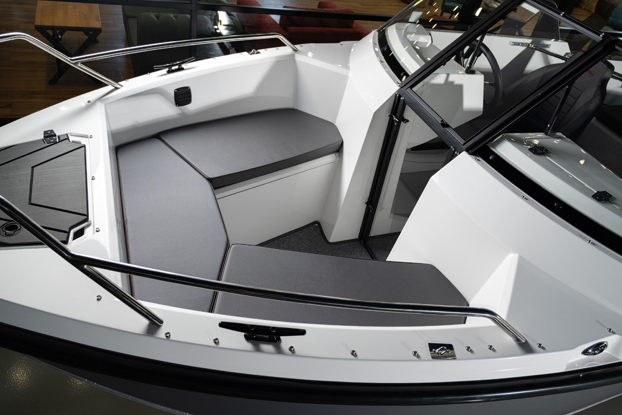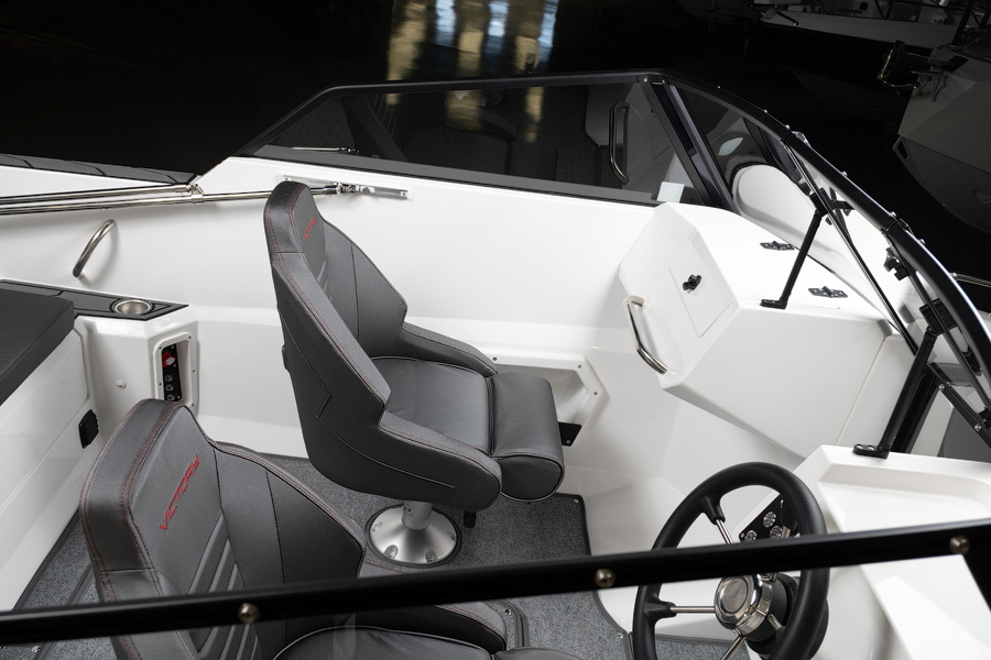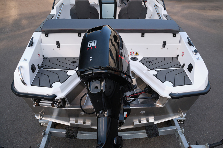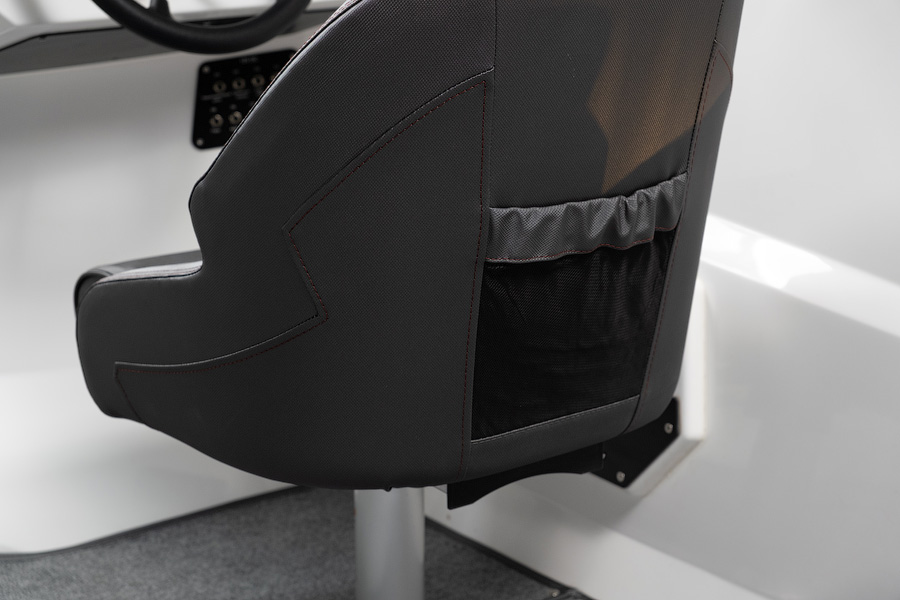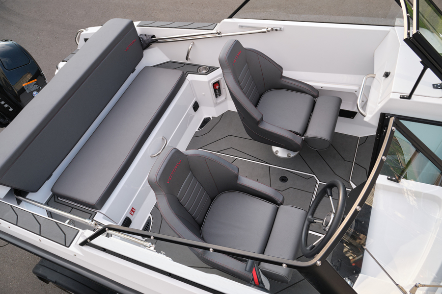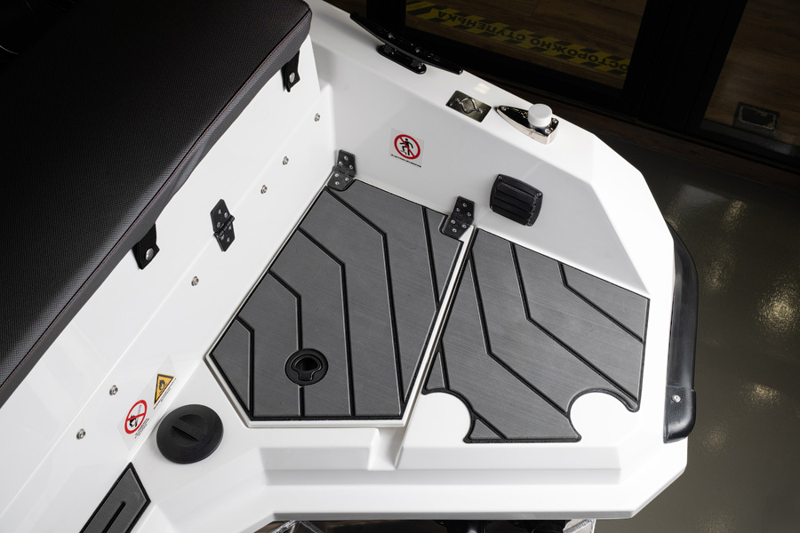 Максимальная пассажировместимость составляет 5 человек. Для борта предусмотрено оснащение подвесным мотором мощностью 80 л/c. Салон укомплектован регулируемыми сиденьями. Тканая обивка Spradling характеризуется стойкостью к ультрафиолету, не разрушается от агрессивных сред и не намокает.
