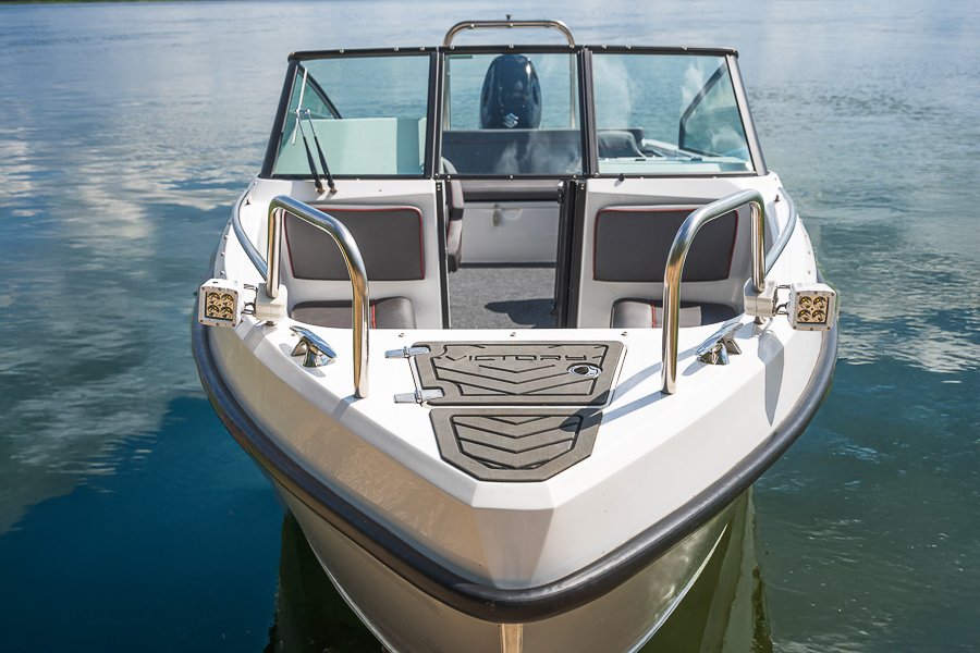 В стандартной комплектации от Victory Boats — отделка с элементами из нержавеющей стали. Салон оснащен сиденьями Springfield, произведенными в США. Днище изготовлено в Самаре, из алюминиево-магниевого сплава 5083. Материал характеризуется стойкостью даже к соленой воде. В комплект входят:
