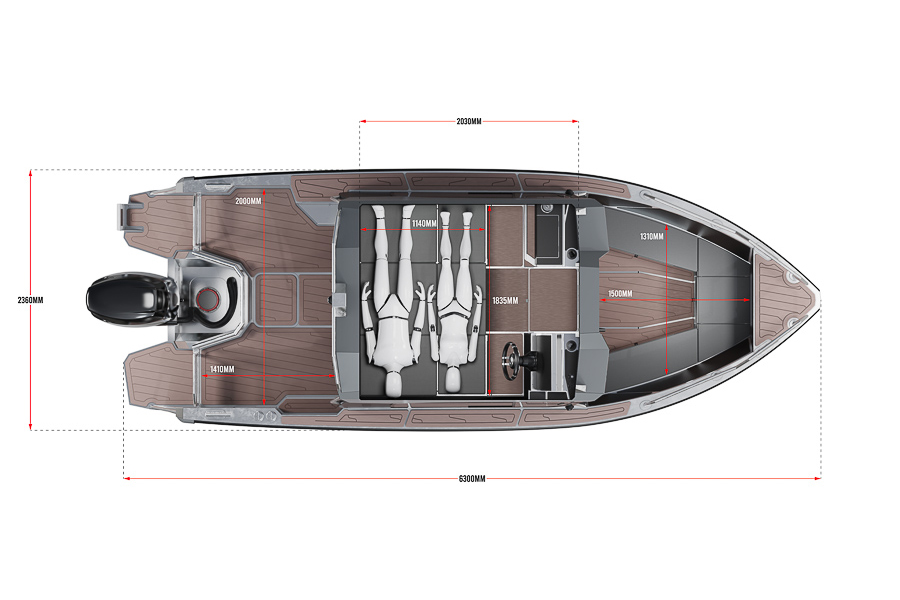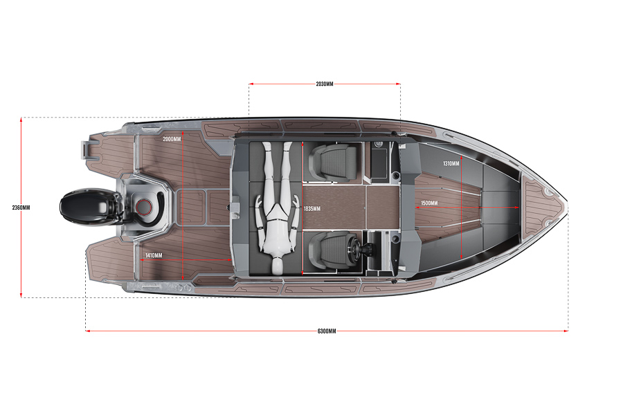 Максимальная пассажировместимость — 6 человек. Длина — 5.9, а ширина — 2.36 метра. Вес судна — 1 110 килограмм.